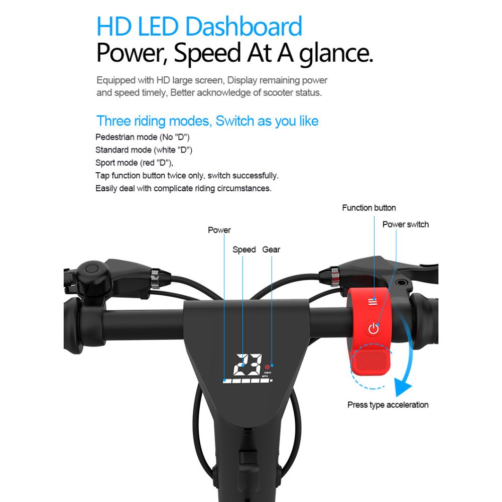 The rear wheel drive Cruzaa Commuta Pro Max Electric Scooter is fully electric, making everyday social and transport an effortless pleasure, with an impressive range of up to 100km (62 miles), a top speed of 25mph, and comes with a large LED Screen Display with 3 throttle modes in which different levels of speeds can be adjusted.
